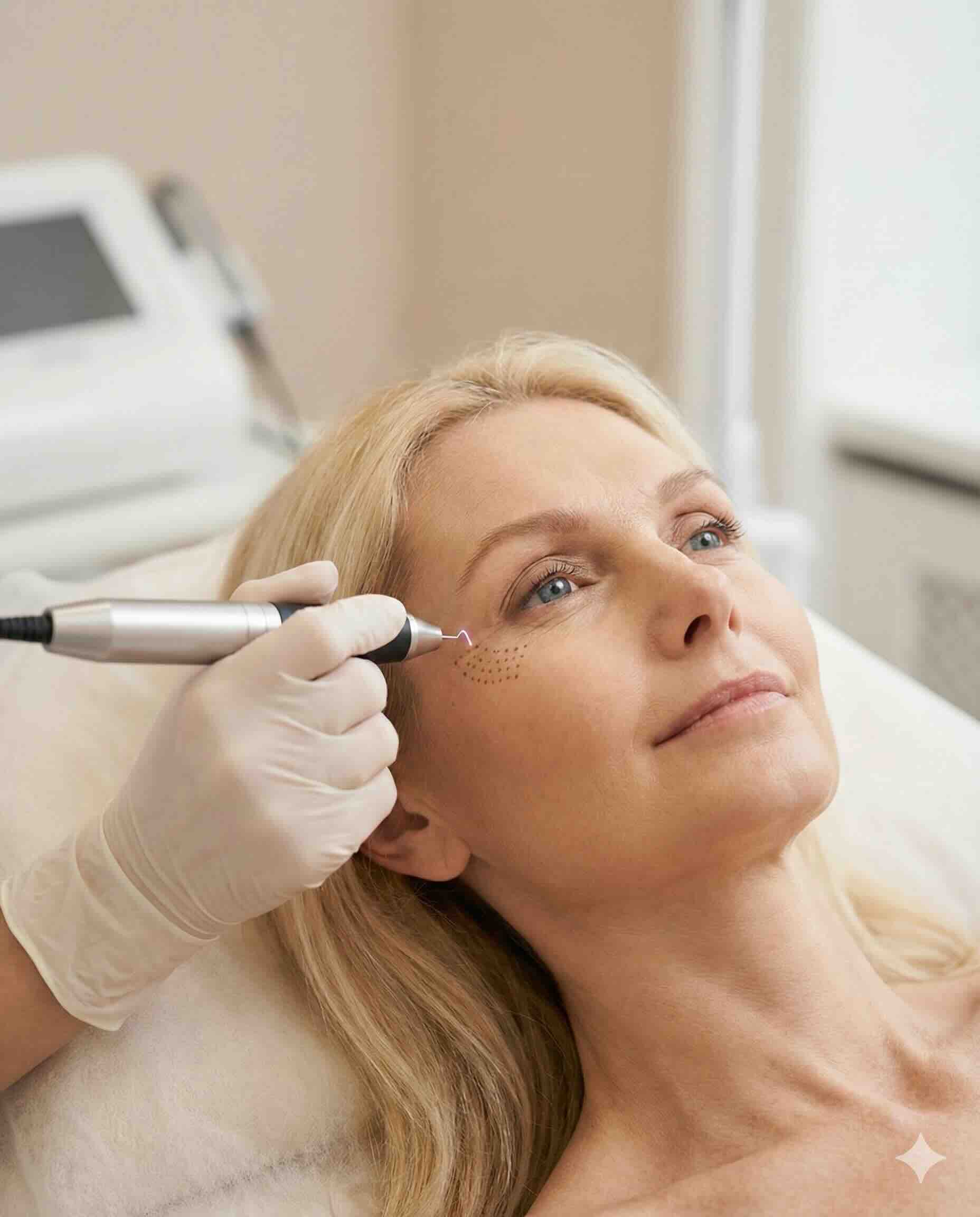 Das Luxus PlasmaLiner-Handstück erzeugt an seiner Spitze einen winzigen, sogenannten Plasmablitz. Dieser Blitz springt von der Spitze auf die Haut über und lässt sie dort in einem winzigen, mikromillimetergroßen Punkt oberflächlich verdampfen. Dieser oberflächliche Punkt zieht in seiner unmittelbaren Umgebung die Haut minimal zusammen. Es werden weitere Punkte eingebracht und erzeugen ein „Reduktionsraster“. Durch die Art ihrer Anordnung können diese Punkte Hautüberschüsse ausgleichen.