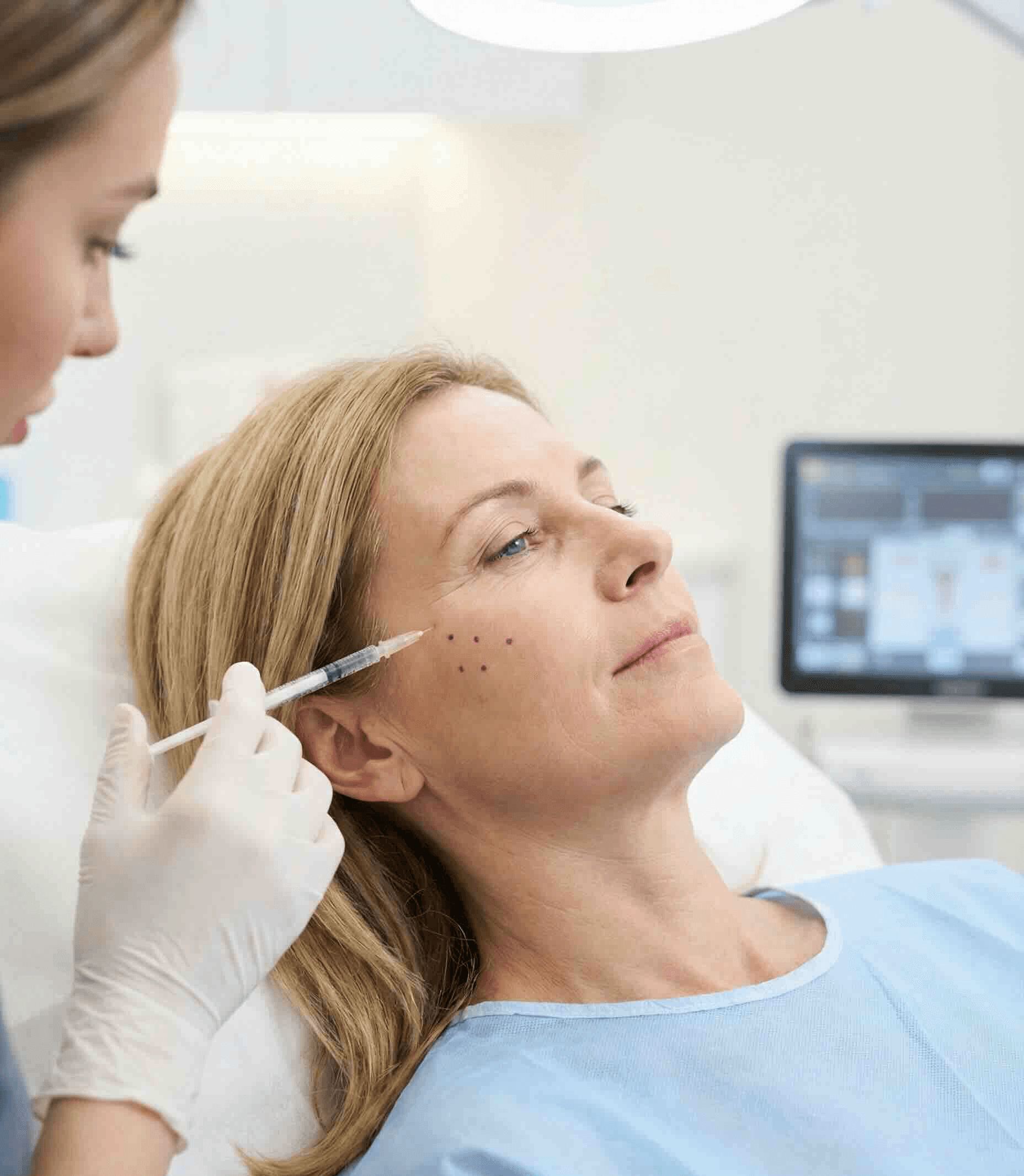 An fünf definierten Injektionspunkten je Gesichtshälfte wird PROFHILO® in kleinsten Mengen mit sehr feinen Nadeln injiziert. Durch seine besondere Beschaffenheit sowie der speziellen BAP-Injektionstechnik (Bio Aesthetic Points) verteilt sich PROFHILO® von selbst im Gewebe. So profitiert Ihre gesamte Gesichtshaut von seiner feuchtigkeitsbindenden Wirkung.